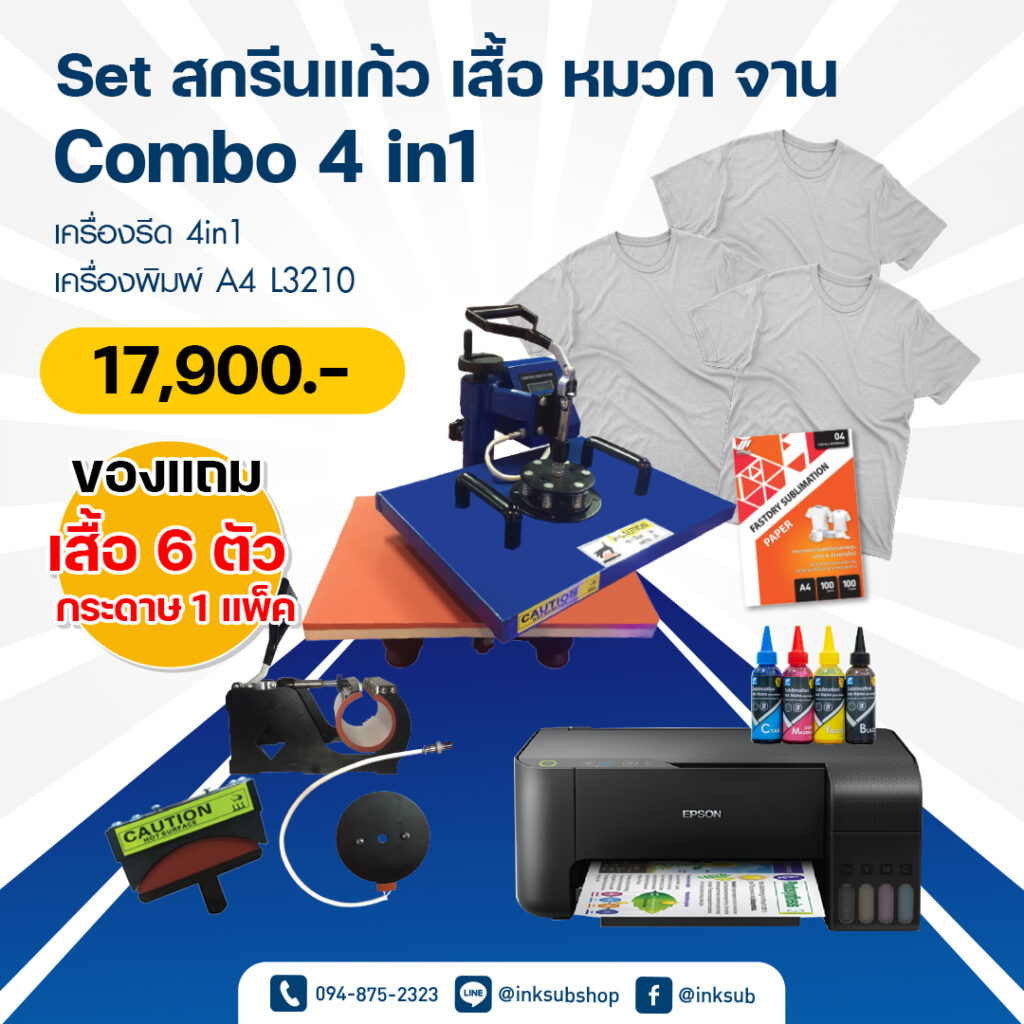 ก็เพราะชุด Set Combo 4in1 ชุดนี้ราคาดีคุ้มค่าสำหรับการลงทุน ภายในชุดเครื่องรีดร้อนมีอุปกรณ์ต่อพ่วงถึง 4อย่างในหนึ่งเครื่อง คุณสามารถทำได้ทั้ง เสื้อ,แก้ว,หมวก,จาน จบครบทุกอย่างภายใน Set นี้